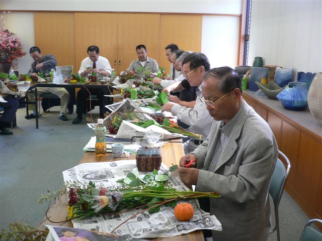 宮原会員から、花かごのアレンジメントの説明を受け、各自試行錯誤しながら